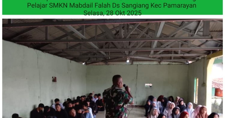 Babinsa Kodim 0602/Serang yang bertugas di Koramil 0602-20/Pamarayan, Sertu Saepudin, melaksanakan kegiatan Pembinaan Ketahanan Wilayah (Bintahwil) dengan memberikan materi Wawasan Kebangsaan (Wasbang) kepada para pelajar, bertempat di SMK Negeri Mabdail Falah, Desa Sangiang, Kecamatan Pamarayan, Kabupaten Serang, Provinsi Banten, Selasa (28/10/2025).