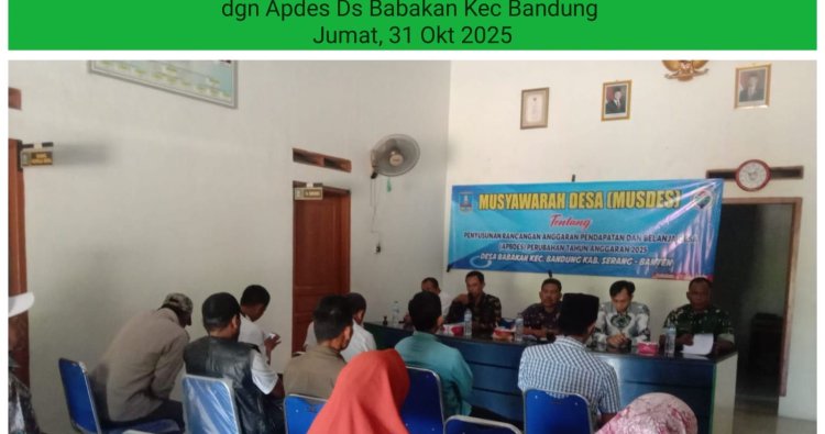 Babinsa Koramil 0602-20/Pamarayan Kodim 0602/Serang, Pelda Sunyoto, menghadiri kegiatan Musyawarah Desa (Musdes) mengenai Penyusunan Rancangan Anggaran Pendapatan dan Belanja Desa (APBDES) Perubahan Tahun Anggaran 2025, bertempat di Kantor Desa Babakan, Kecamatan Bandung, Kabupaten Serang, Provinsi Banten, Jum'at (31/10/2025).