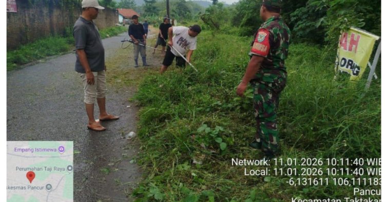 Banten, - Menunjukkan kepedulian terhadap kebersihan lingkungan, Babinsa Koramil 0602-04/Taktakan Kodim 0602/Serang, Sertu Sentot, turun langsung membaur bersama warga dalam aksi gotong royong pembersihan jalan.
